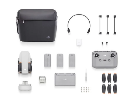 The DJI Mini 2 Combo set also includes useful additional accessories. The package contains as many as 3 batteries (the standard version has only 1), which, combined with a charging hub that charges them all sequentially, allows you to extend the operating time of the device. A special propeller lock ensures safer transportation of the drone, and a dedicated bag allows for convenient storage and carrying. The set also includes a practical DJI 18 W USB charger.