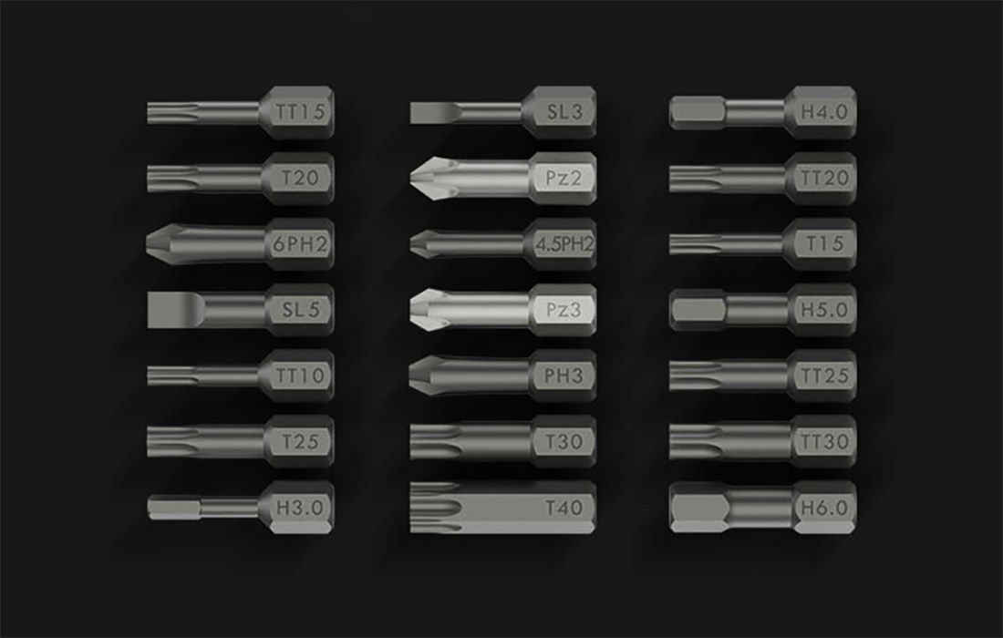 Każdy z elementów ma swoje z góry wyznaczone miejsce, które pomaga w organizacji i utrzymywaniu porządku w bitach. Ponadto każdy z bitów mocno siedzi na swoim miejscu, ze względu na magnetyczną obudowę.